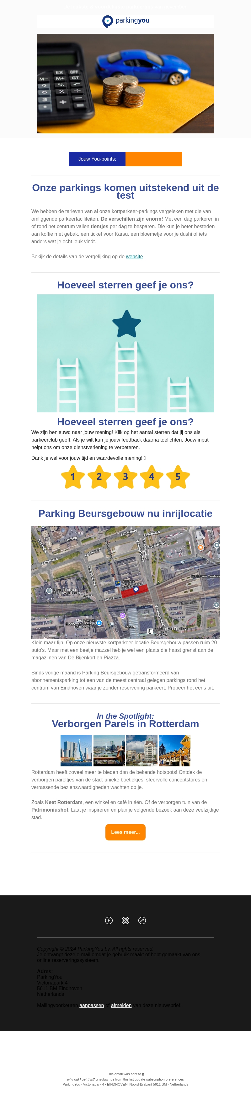 In de nieuwsbrief van januari 2025 van ParkingYou worden parkeertarieven vergeleken en verborgen pareltjes in Rotterdam onthuld. Lees over onze nieuwste parkeerlocatie Beursgebouw en beoordeel onze service. Ontdek hoe je kunt besparen op jouw parkeerkosten en wat Rotterdam te bieden heeft naast de bekende hotspots.