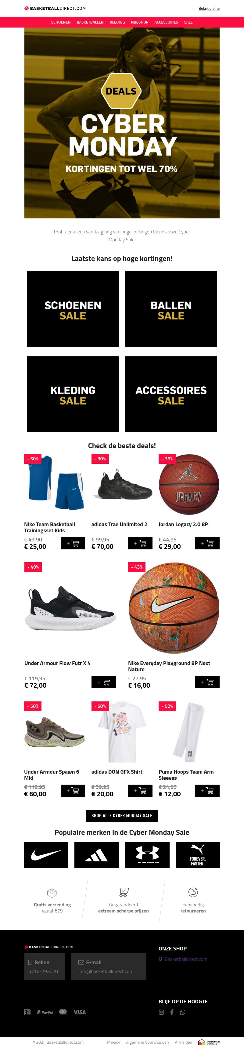 Mis de laatste kans niet om te profiteren van fantastische Cyber Monday deals bij BasketballDirect.com. Ontvang aanzienlijke kortingen tot 70% op een breed scala aan producten, waaronder schoenen, basketballen, kleding en accessoires. Dit is hét moment om jouw favoriete sportuitrusting voor een fractie van de prijs aan te schaffen.