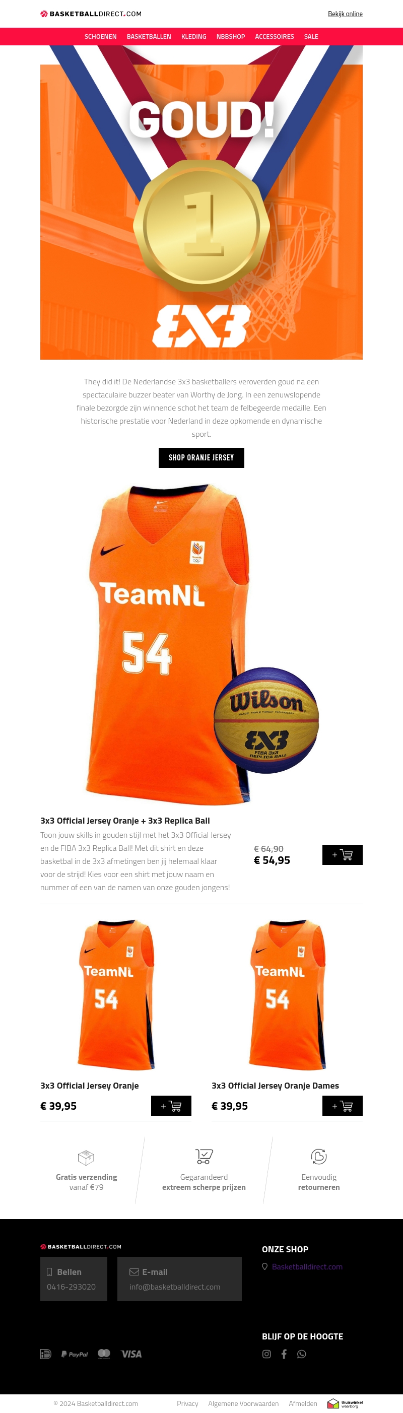 TeamNL 3x3 basketbalteam heeft goud gewonnen en jij kunt nu ook schitteren! Bestel het officiële 3x3 TeamNL Jersey en bijpassende replica bal bij BasketbalDirect.com. Ga voor goud en toon jouw skills in stijl.