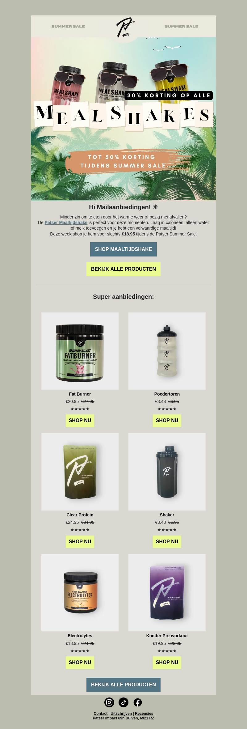 Geniet van heerlijke maaltijdshakes voor maar β¬18,95 tijdens de Patser Summer Sale! Perfect voor de zomer, laag in calorieΓ«n en makkelijk te bereiden met water of melk. Bekijk ook onze andere geweldige aanbiedingen zoals Fat Burner, Clear Protein en meer. Mis het niet!