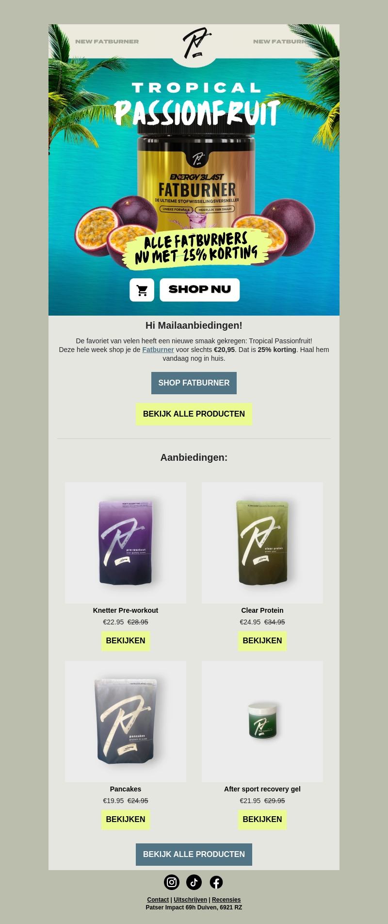 Hi Mailaanbiedingen! De favoriet van velen heeft een nieuwe smaak gekregen: Tropical Passionfruit! Deze hele week shop je de Fatburner voor slechts €20,95. Dat is 25% korting. Haal hem vandaag nog in huis.