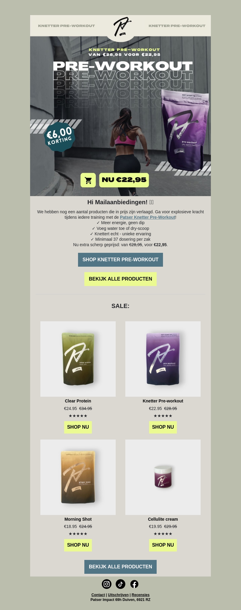 Hi Mailaanbiedingen! Ontdek de nieuwste sale op Patser Knetter Pre-Workout. Verhoog je energie en ervaar een unieke pre-workout boost voor slechts €22,95. Beperkte voorraad! Bekijk nu ook andere afgeprijsde producten.