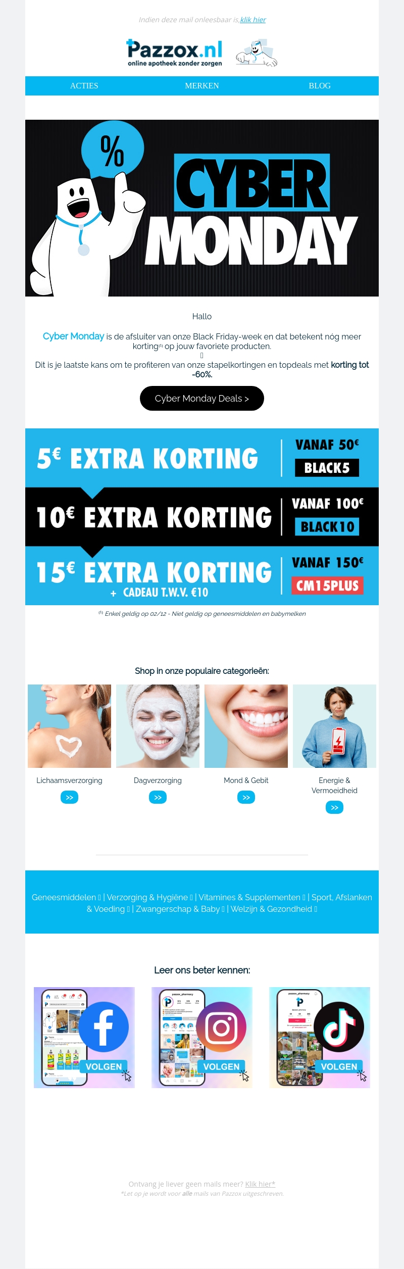 Profiteer van spectaculaire Cyber Monday kortingen met Pazzox.nl. Ontvang tot €15 extra korting en een cadeau van €10 met de juiste couponcodes. Mis deze afsluiter van de Black Friday-week niet. Deze aanbiedingen zijn alleen geldig op 02/12. Ontdek ook onze populaire categorieën zoals lichaamsverzorging en dagverzorging. Shop nu en bespaar groot!