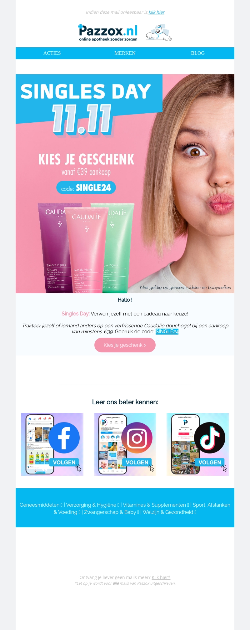 Vier Singles Day met een cadeautje naar keuze bij elke bestelling vanaf €39. Gebruik de code SINGLE24 voor een verfrissende Caudalie douchegel. Mis deze kans niet om jezelf te verwennen!