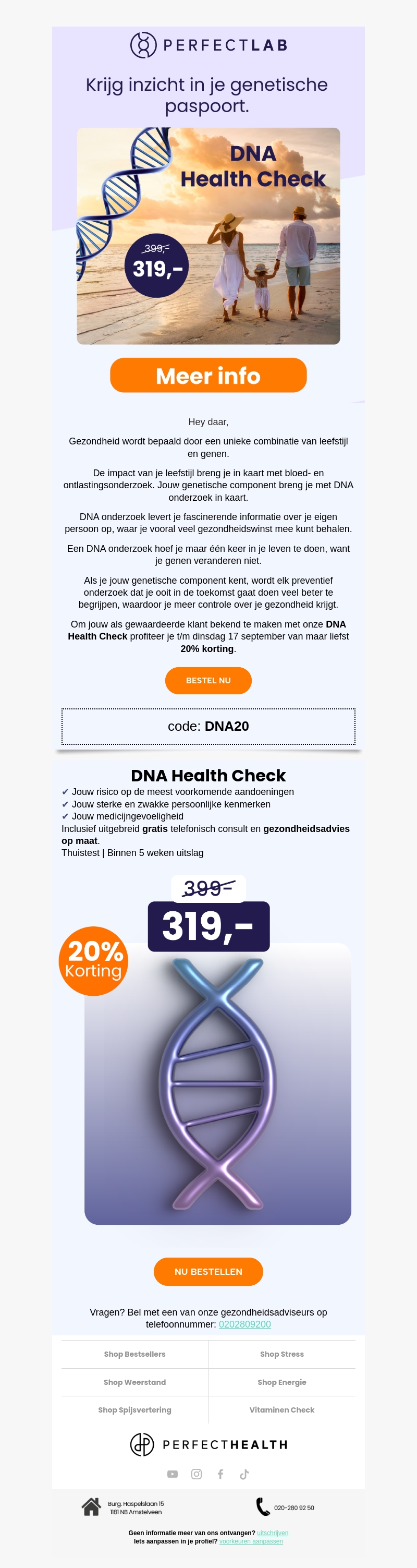 Krijg nu inzicht in je genetische paspoort met de DNA Health Check van Perfectlab. Deze test biedt je fascinerende informatie over je gezondheid en helpt je een gezondere leefstijl te ontwikkelen. Profiteer nu van 20% korting tot 17 september.