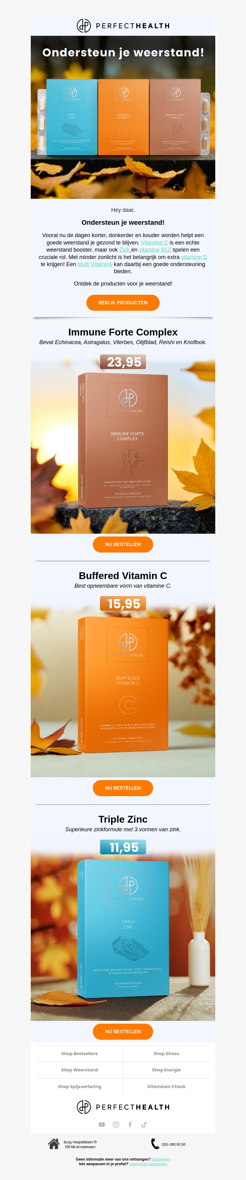 Blijf gezond en sterk met de immuunversterkende producten van PerfectHealth. Vitamine C, Vitamine D, Zink en meer spelen een cruciale rol in het behouden van je gezondheid, vooral tijdens de koudere maanden. Onze producten bieden de essentiële voedingsstoffen die je nodig hebt.