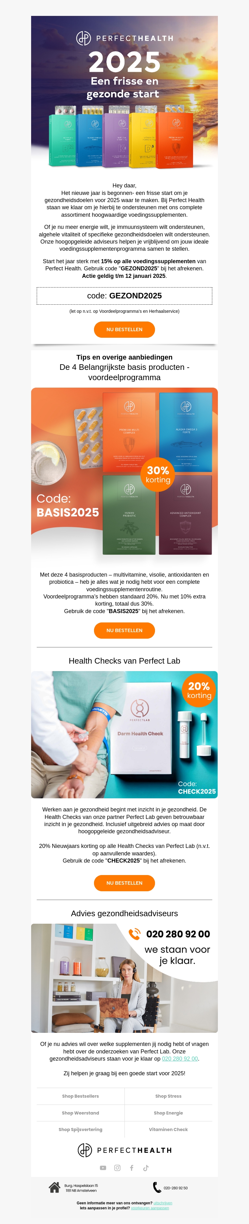 Start het nieuwe jaar fris en gezond met Perfect Health's assortiment aan hoogwaardige voedingssupplementen. Profiteer van 15% korting met code GEZOND2025. Ontdek ook de top 4 basisproducten met 30% korting. Begin je reis naar een betere gezondheid met de Health Checks van Perfect Lab. Onze gezondheidsadviseurs staan klaar om je advies te geven voor 2025.
