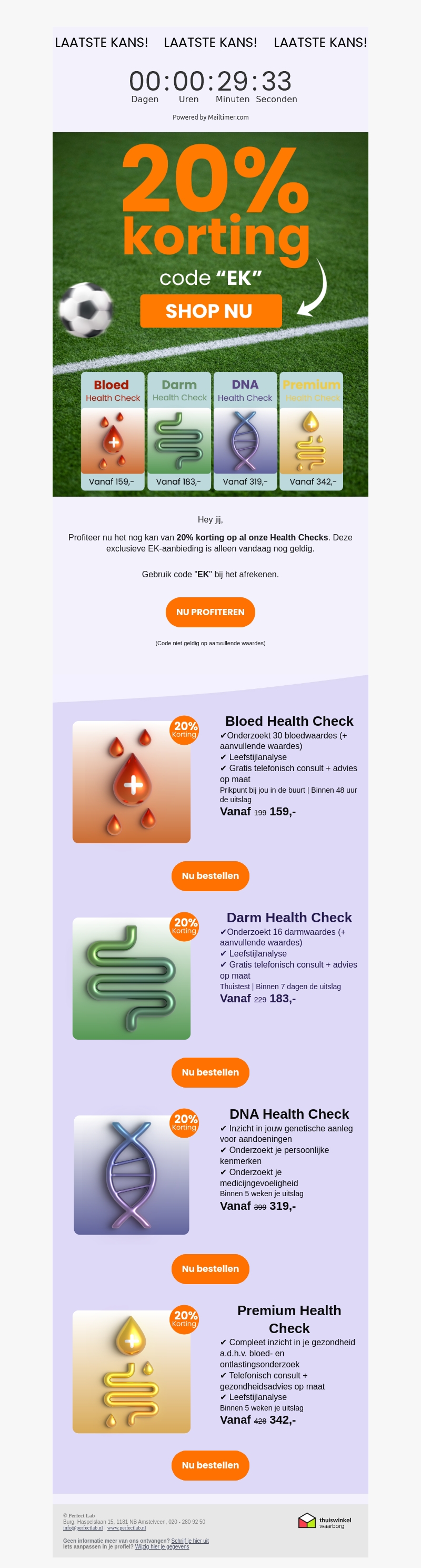 Mis deze exclusieve EK-aanbieding niet! Profiteer nog vandaag van 20% korting op al onze Health Checks. Gebruik code 'EK' bij het afrekenen en krijg direct korting op jouw bloed-, darm-, DNA- en Premium Health Checks.