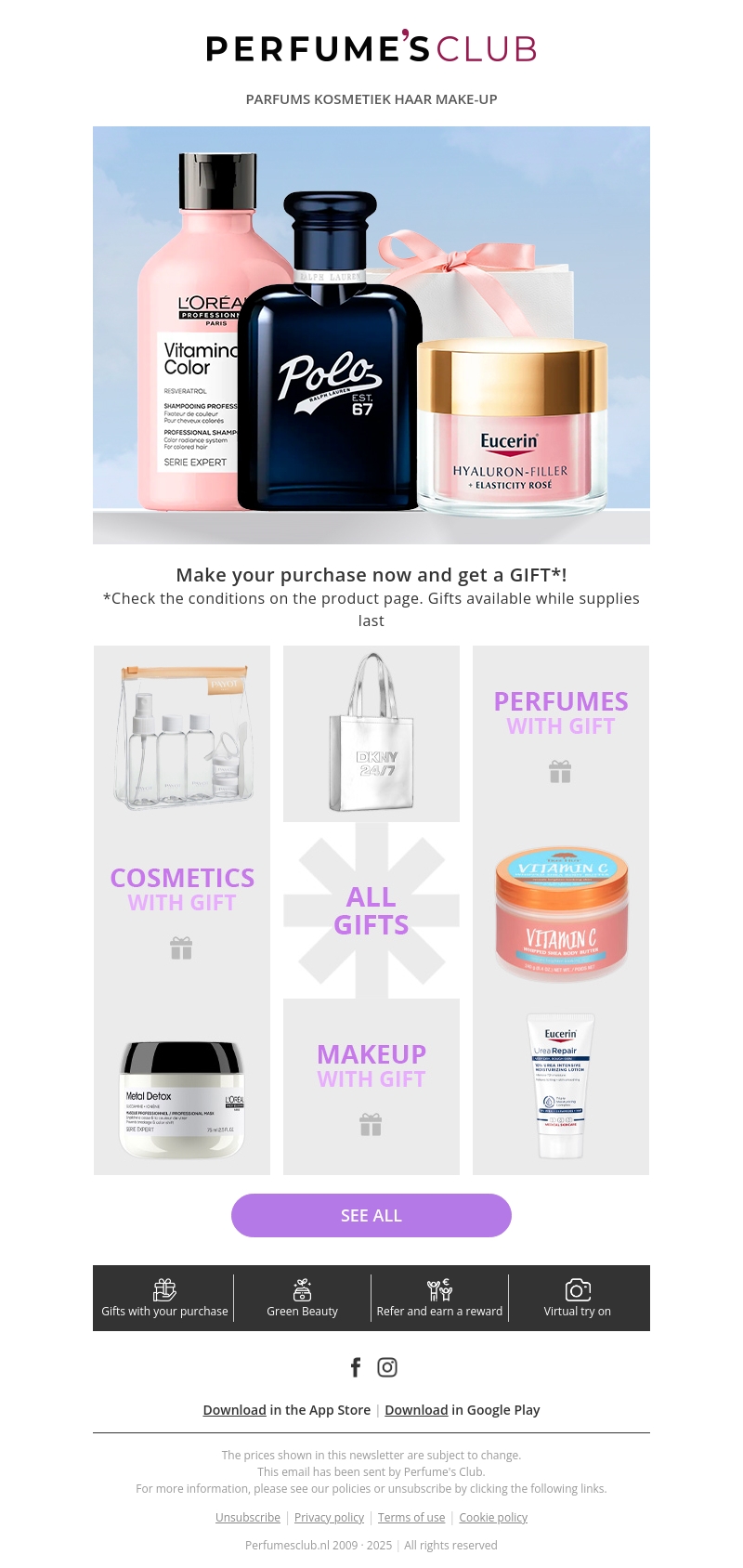 Ontdek nu exclusieve aanbiedingen bij Perfume's Club. Bij aankoop van geselecteerde producten ontvang je een gratis cadeau. Kies uit parfums, cosmetica en meer. Bekijk de voorwaarden en grijp je kans zolang de voorraad strekt.
