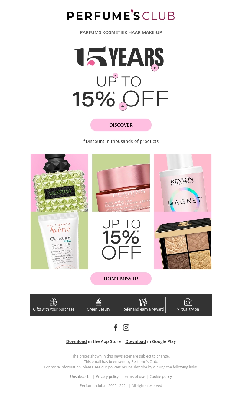 Vier het 15-jarig jubileum van Perfume's Club met ongelooflijke kortingen tot 15% op parfums, cosmetica, haarproducten en make-up. Deze promotie geldt voor duizenden producten. Ontdek nu de beste aanbiedingen en geniet van de voordelen. Wees snel, want de sale eindigt binnenkort!