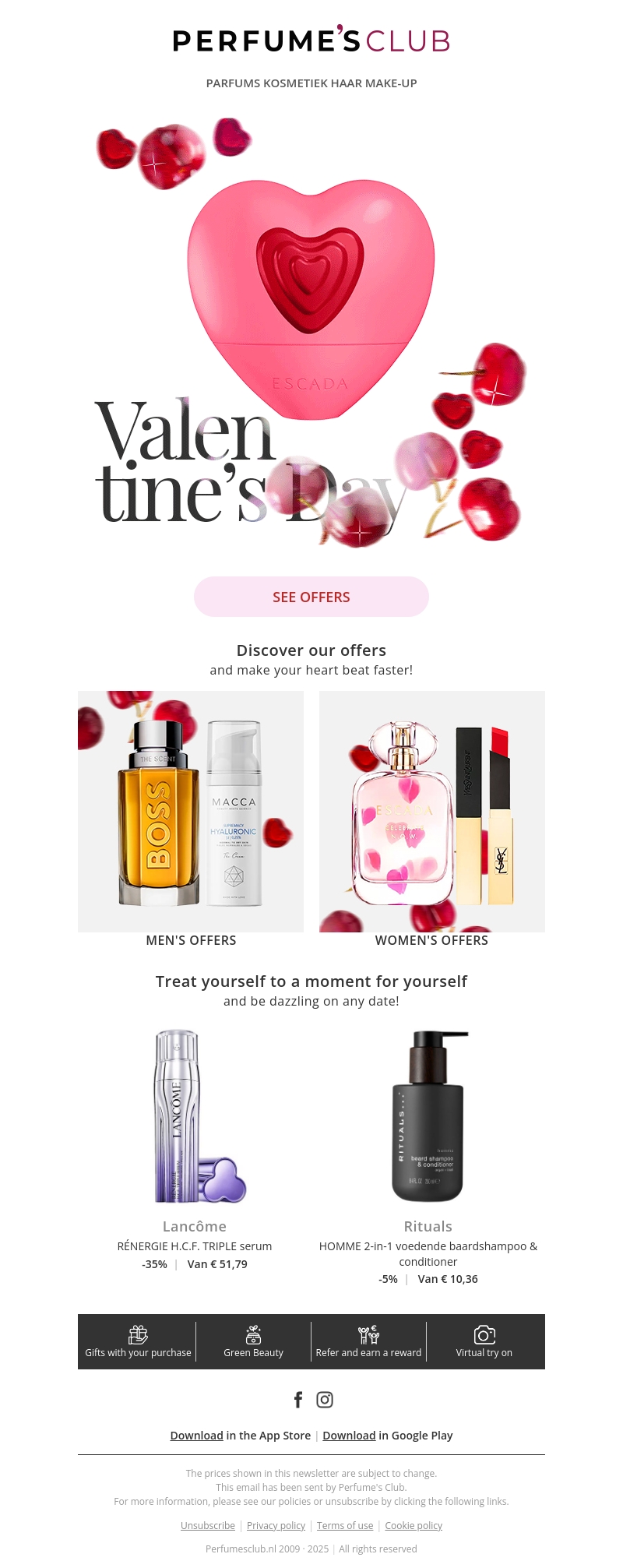 Vier liefde met geweldige kortingen op uw favoriete parfums en beautyproducten. Ontdek speciale aanbiedingen voor zowel mannen als vrouwen. Trakteer uzelf of een geliefde met merken zoals Lancôme en Rituals. Maak een blijvende indruk met exclusieve cadeaus. Begin nu met winkelen en geniet van luxe kortingen. Mis de kans niet om deze Valentijnsdag speciaal te maken.