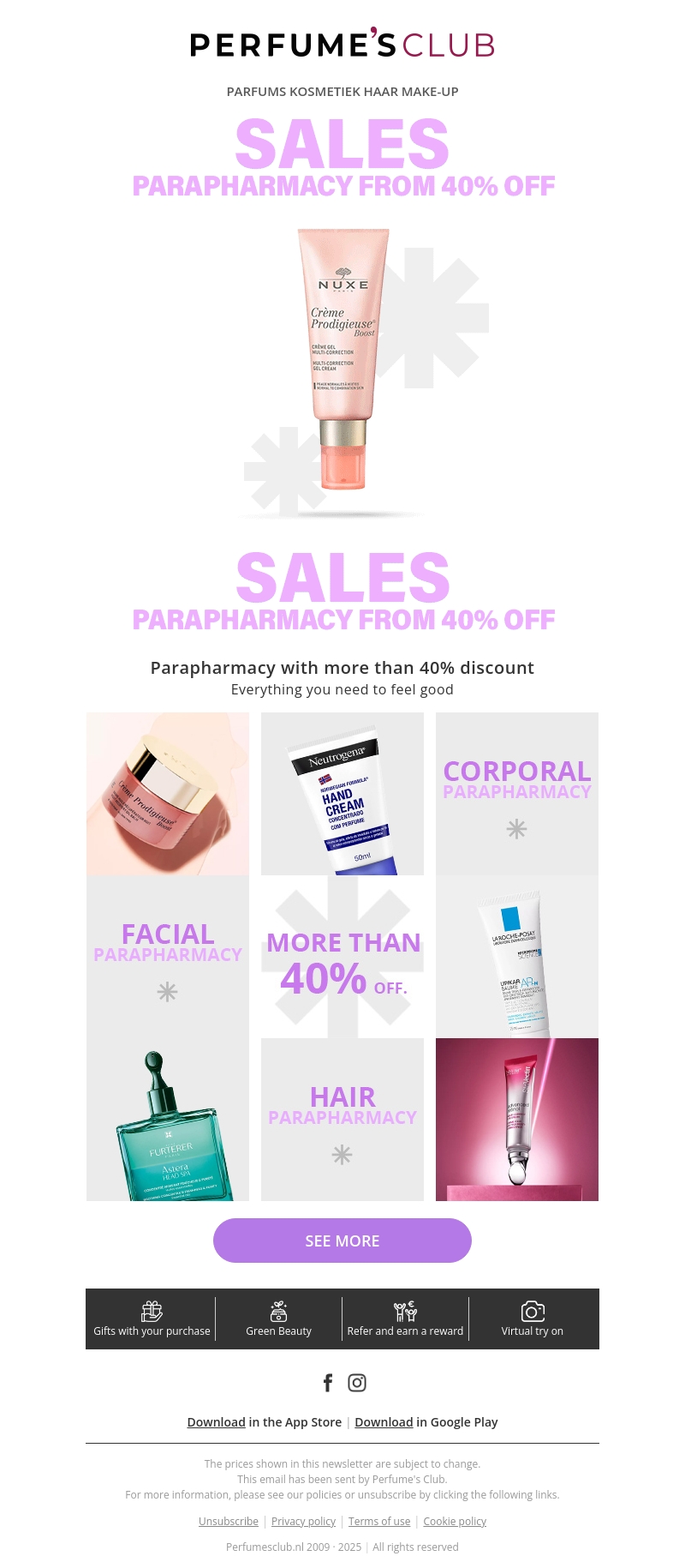 Profiteer van meer dan 40% korting op diverse parapharmacy producten bij Perfume's Club. Ontdek alles wat je nodig hebt om je goed te voelen, van gezichtsverzorging tot haarverzorging. Mis deze kans niet om topmerken te scoren voor een zachte prijs.