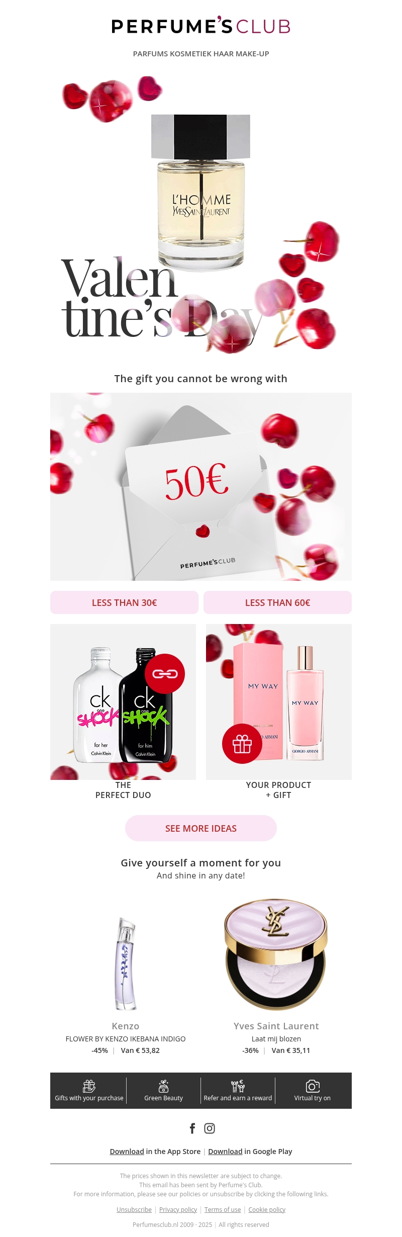 Beleef een onvergetelijke Valentijnsdag met de perfecte geuren van Perfume's Club. Ontdek onze speciale aanbiedingen en kortingen voor hem en haar. Vind jouw ideale geschenk onder de 30€ of 60€ categorieën. Maak van deze dag een bijzondere herinnering met ons uitgebreide assortiment aan parfums en beautyproducten.