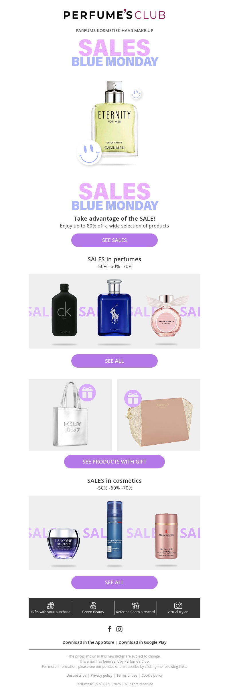 Vier Blue Monday met een glimlach dankzij de enorme uitverkoop bij Perfume’s Club. Ontvang tot wel 80% korting op topmerken in parfums en cosmetica. Mis de kans niet om je favorieten in te slaan en geniet van extra cadeaus bij je aankoop.