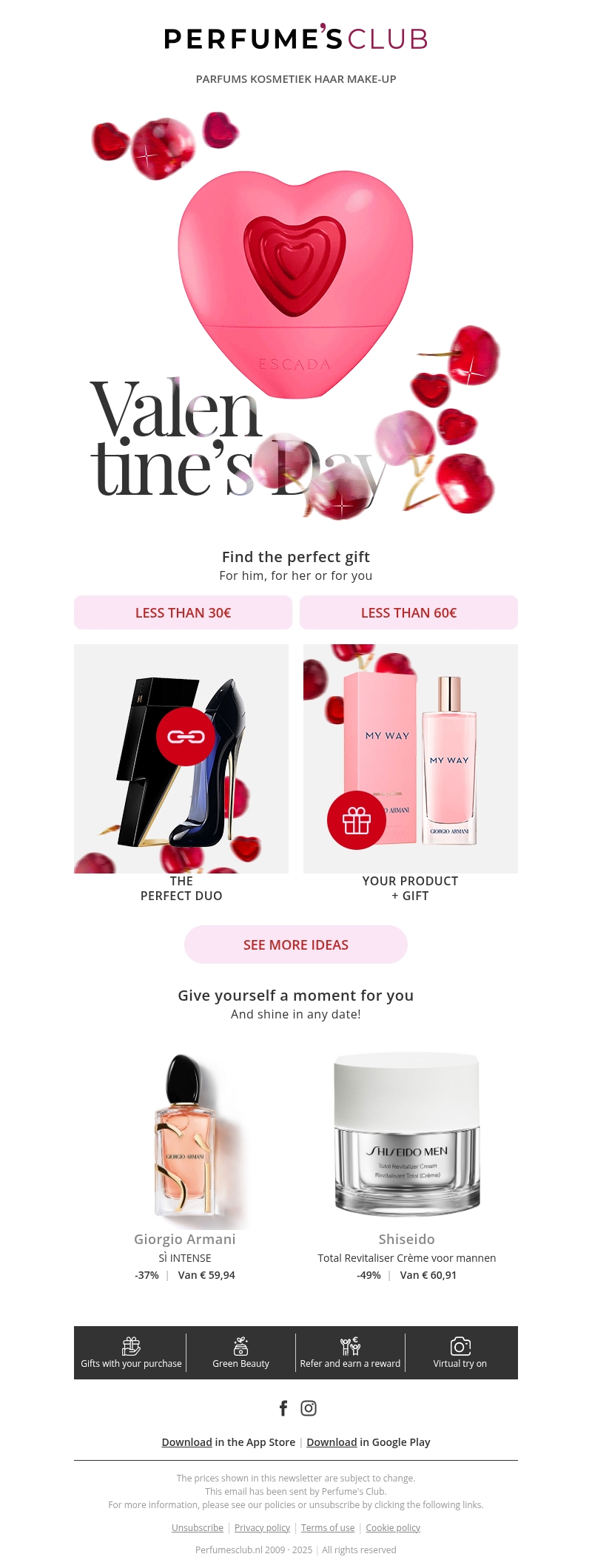 Vier Valentijnsdag met exclusieve aanbiedingen van Perfume's Club. Of je nu zoekt naar een luxe parfum of huidverzorging, er is iets speciaals voor iedereen. Kies uit cadeaus onder 30€ of ga voor luxe opties onder 60€. Bovendien ontvang je bijzondere kortingen op merken zoals Giorgio Armani en Shiseido. Verwen jezelf of een geliefde met deze onweerstaanbare deals.