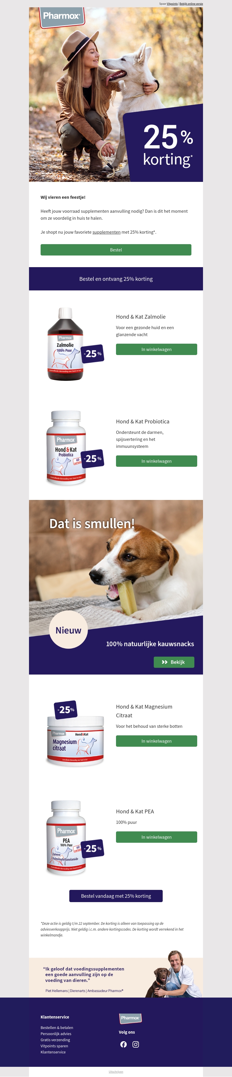 Wij vieren een feestje met 25% korting op hond- en kataanbiedingen! Mis deze kans niet om jouw favoriete supplementen in te slaan. Van zalmolie tot magnesium citraat, wij hebben het allemaal. Wacht niet te lang en profiteer nu.