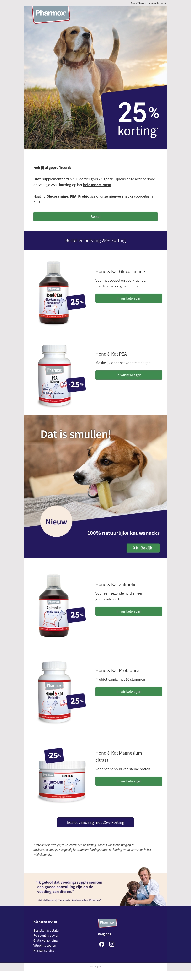 Profiteer nu van 25% korting op ons hele assortiment aan supplementen voor honden en katten. Of je nu zoekt naar Glucosamine, PEA, of natuurlijke kauwsnacks, we hebben het allemaal beschikbaar. Haal jouw favoriete producten nu voordelig in huis en versterk de gezondheid van je huisdier.