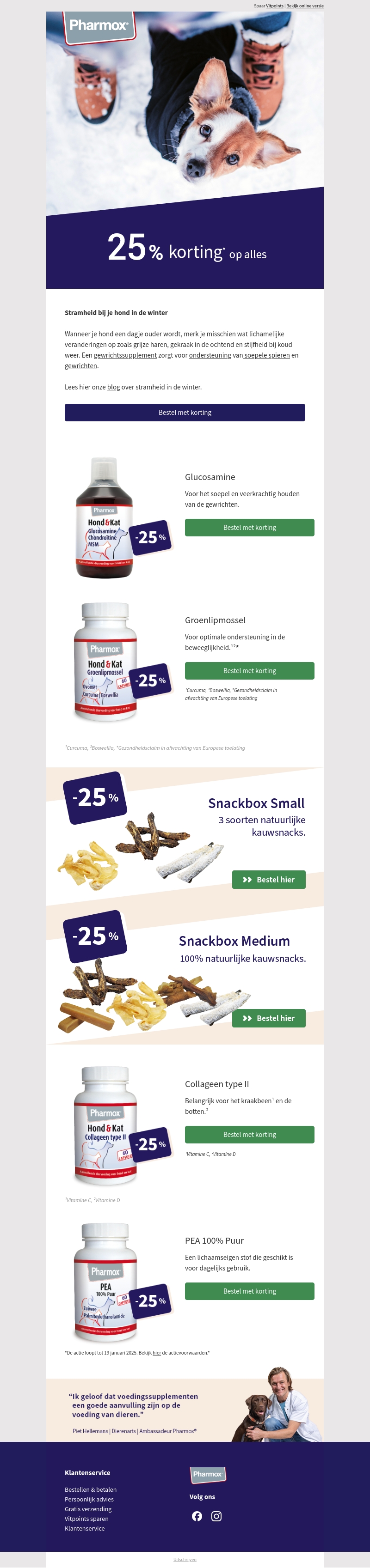 Deze winter biedt Pharmax een geweldige korting van 25% op al hun producten. Zorg ervoor dat uw hond soepel en fit blijft met de juiste supplementen zoals Glucosamine en Groenlipmossel. Daarnaast kunt u ook kiezen uit verschillende gezonde snacks die perfect zijn voor de koude dagen. Mis deze kans niet en bestel nu met korting. De actie loopt tot 19 januari 2015.