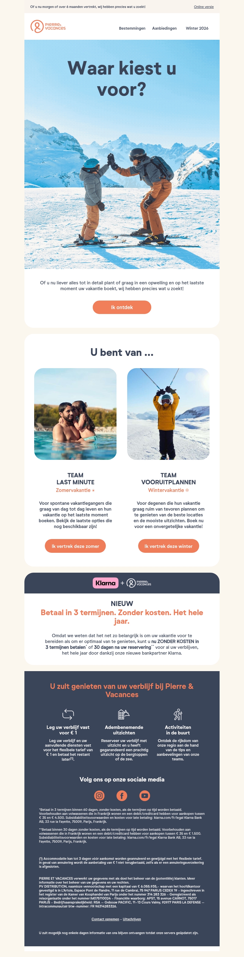 Bent u een spontane avonturier of plant u liever alles van tevoren? Bij ons vindt u zowel last-minute deals voor de zomer als vooruitboekingen voor de winter. Profiteer van de mogelijkheid om in 3 termijnen te betalen, zonder extra kosten. Verken onze unieke bestemmingen en maak uw keuze.