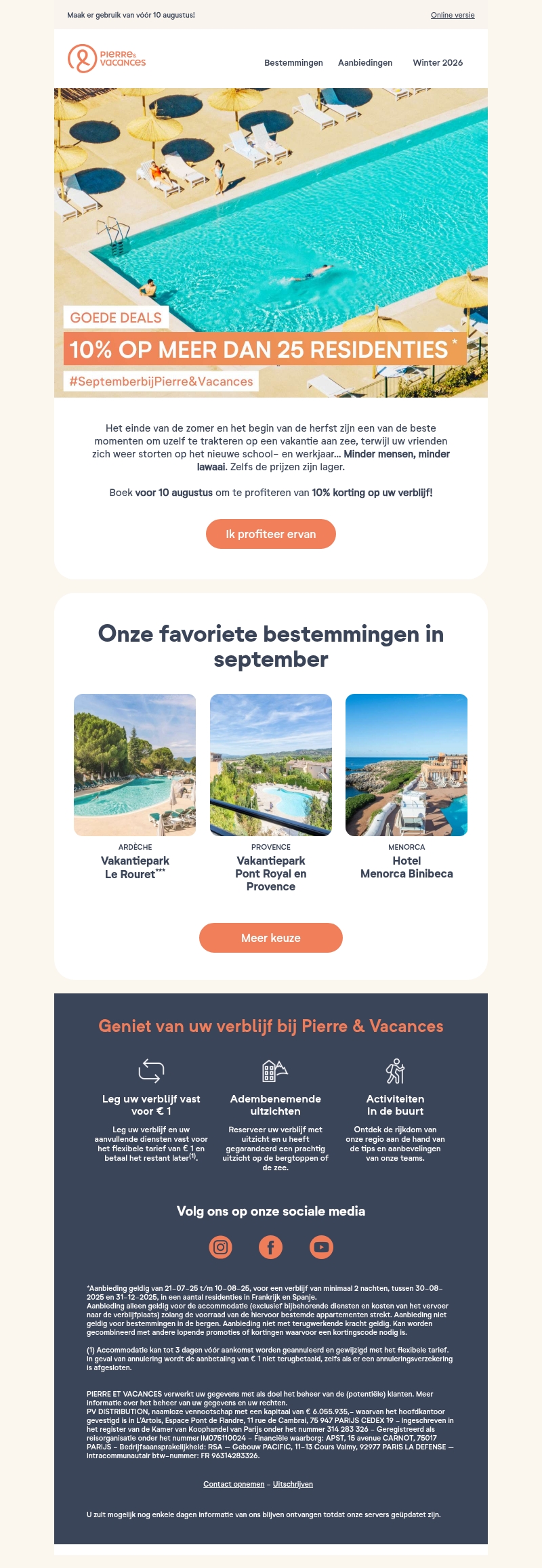 Het einde van de zomer is nabij en dat betekent minder drukte en lawaai. Boek nu en geniet van een korting van 10% op uw verblijf bij geselecteerde residenties. Deze speciale aanbieding is geldig tot 10 augustus. Kies uit bestemmingen zoals Ardèche, Provence en Menorca voor een onvergetelijke ervaring. Profiteer snel van deze unieke kans!