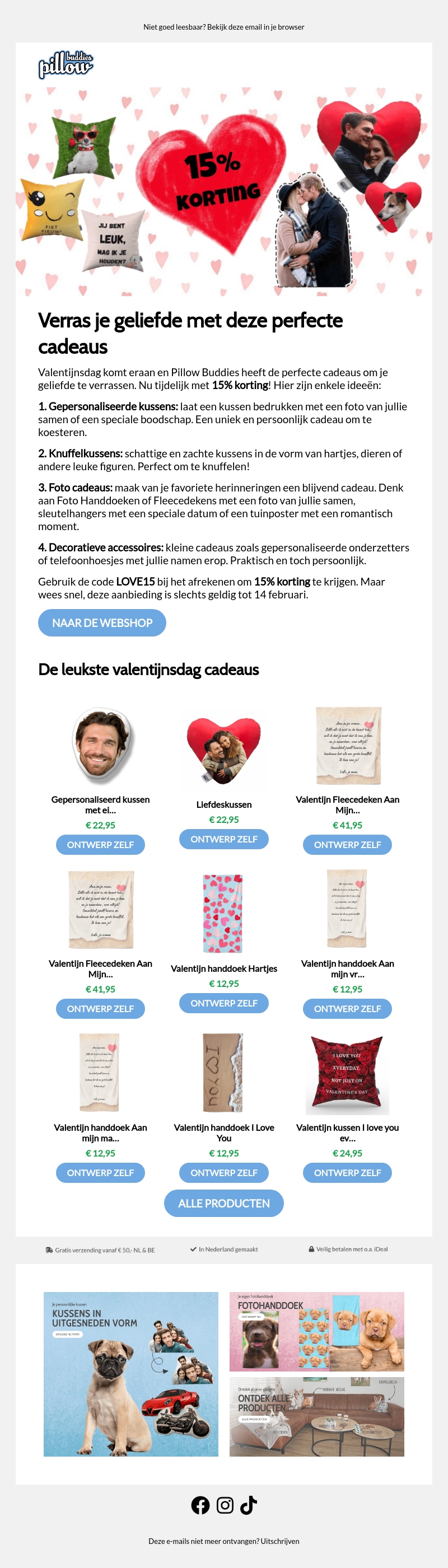Valentijnsdag staat voor de deur en Pillow Buddies biedt de ideale cadeaus aan om je geliefde te verrassen. Profiteer van een tijdelijke 15% korting op gepersonaliseerde kussens, knuffelkussens, fotocadeaus en meer. Gebruik de code LOVE15 en maak van deze Valentijnsdag iets speciaals. Mis het niet, de kortingsactie is geldig tot 14 februari!