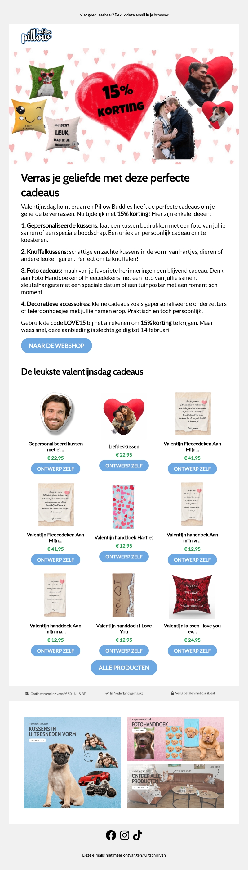 Valentijnsdag is in aantocht en Pillow Buddies biedt de ideale cadeaus om je geliefde te verrassen. Geniet van een tijdelijke 15% korting op gepersonaliseerde kussens, fotocadeaus en knuffelkussens. Of kies voor decoratieve accessoires met een persoonlijk tintje. Bestel voor 14 februari met de code LOVE15.