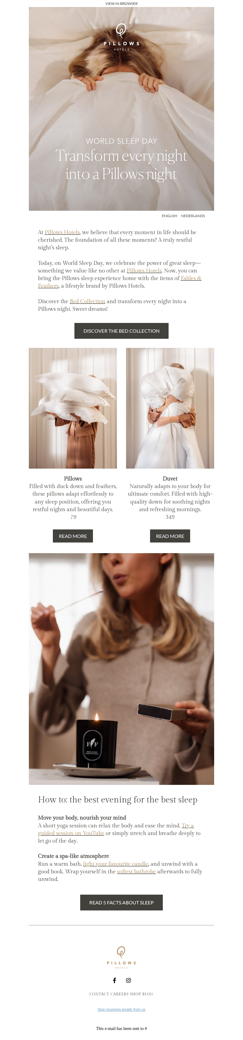 Bij Pillows Hotels wordt elke nacht een onvergetelijke ervaring. Vier Wereld Slaap Dag met onze exclusieve Bed Collection en transformeer je slaaproutine. Ontspan met onze luxe kussens en dekbedden gevuld met eendendons en veren. Creëer de ultieme slaapomgeving met onze tips voor ontspanning. Ontdek hoe kleine aanpassingen je nachtrust kunnen verbeteren.