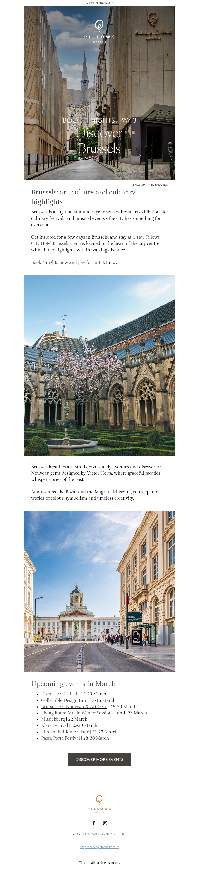 Bezoek Brussel en geniet van kunst, cultuur en culinaire verrassingen. Verblijf in het 4-sterren Pillow City Hotel in het centrum en ontdek alles op loopafstand. Boek nu vier nachten en betaal er slechts drie.