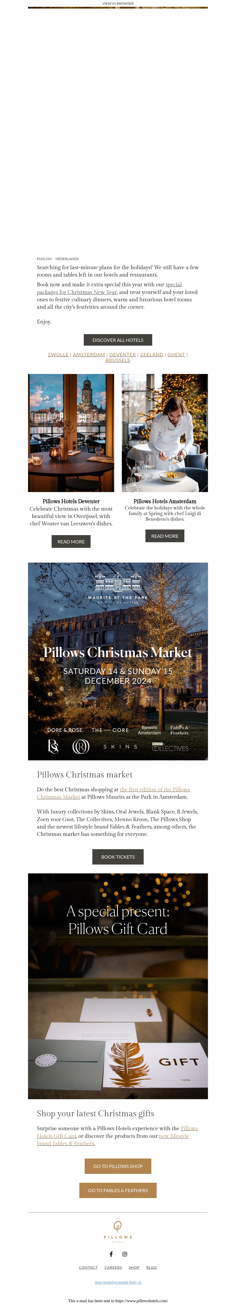 Plan je last-minute kerst met Pillows Hotels. Geniet van luxe kamers, een kerstsfeer en exclusieve markten met designermerken. Verrijk je feestdagen met een speciaal cadeau van Pillows Gift Card of een verrassend item van Fabels & Feathers.