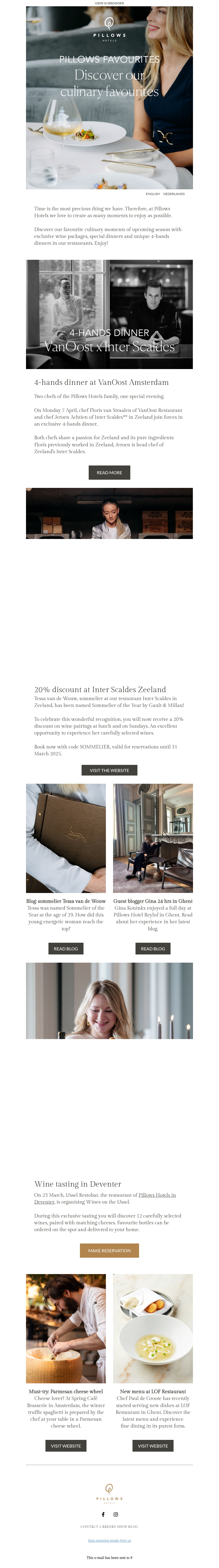 Verwen je smaakpapillen met de nieuwste culinaire creaties van Pillows Hotels. Van unieke dinerervaringen tot exclusieve wijnproeverijen, ontdek wat onze chefs te bieden hebben. Geniet van een 4-handen diner en speciale kortingen bij prestigieuze locaties. Laat je meenemen in een wereld van smaak en finesse.