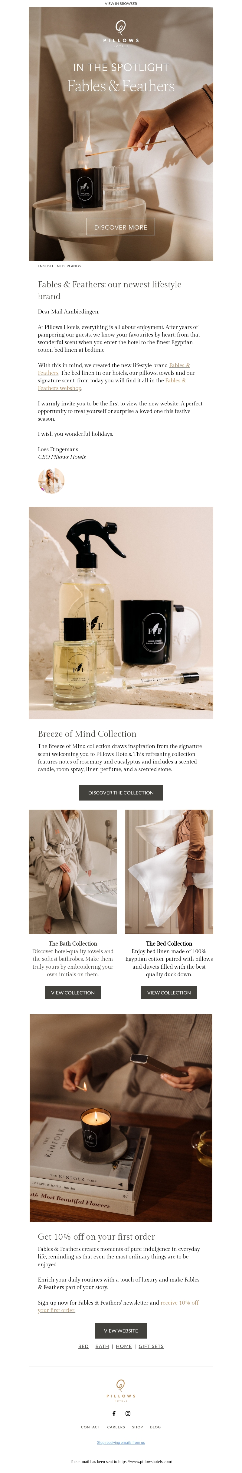 Maak kennis met Fables & Feathers, het nieuwe lifestyle merk van Pillows. Geniet van luxe beddengoed, zachte handdoeken en exclusieve accessoires. De collectie bevat geurkaarsen, kamerparfum en meer om uw dagelijkse leven te verrijken. Winkel nu bij Fables & Feathers en ontvang 10% korting op uw eerste bestelling.