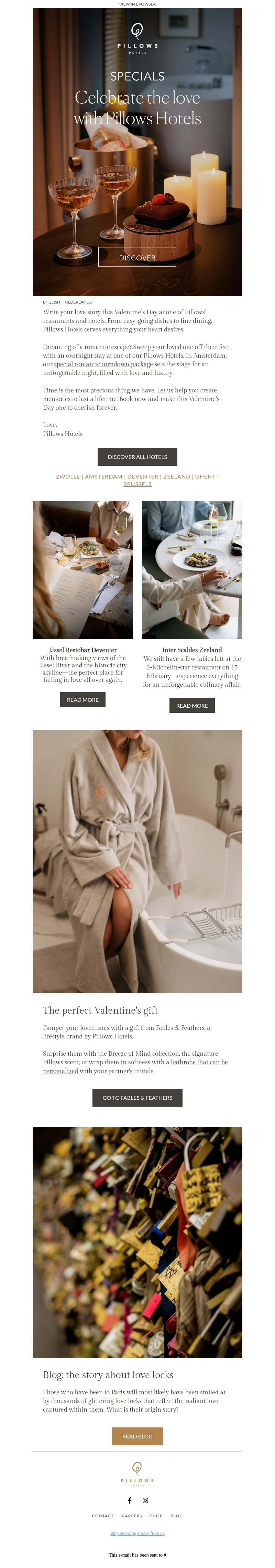 Schrijf je liefdesverhaal met Pillows Hotels deze Valentijnsdag. Geniet van luxe arrangementen en culinaire hoogtepunten in onze topklasse hotels. Verwen je geliefde met speciale cadeaus van Fables & Feathers. Ontdek de geheimen achter de beroemde liefde slotjes in Parijs.