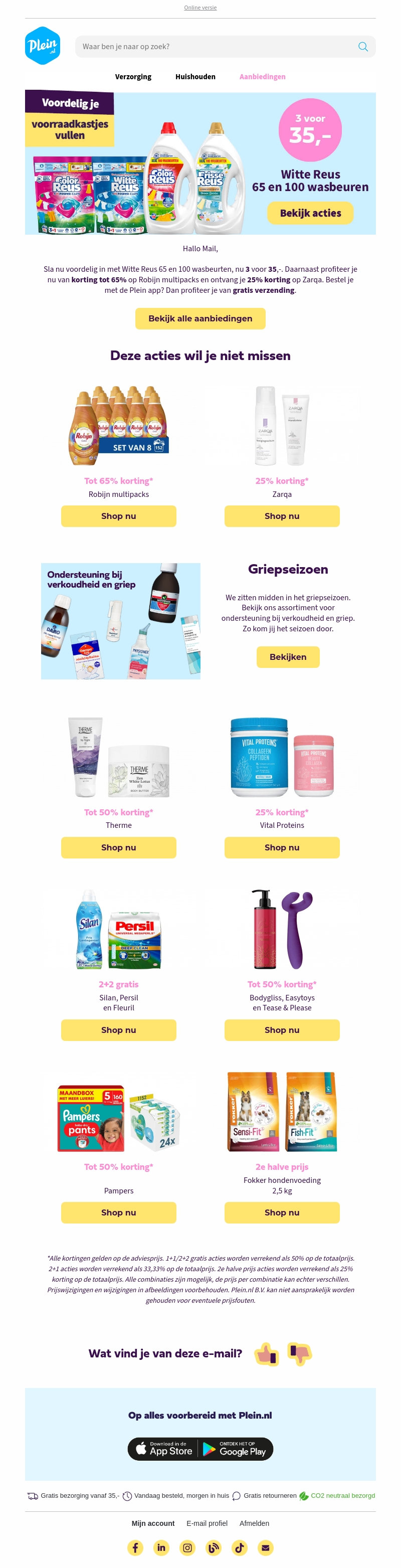 Profiteer van voordelige aanbiedingen bij Plein.nl met Witte Reus deals en kortingen tot 65% op Robijn. Geniet van 25% korting op Zarqa producten en ontdek speciale kortingen voor het griepseizoen. Bespaar ook met acties op The Body Shop en Vital Proteins. Voor huisdierbezitters zijn er speciale deals op Fokker hondenvoeding en Pampers.