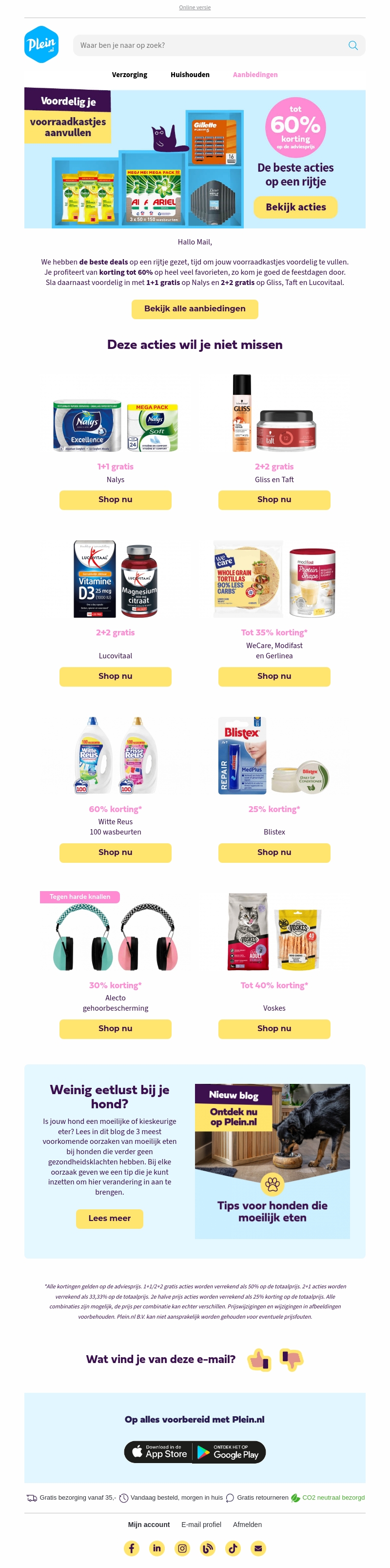 Mis de beste deals niet en vul je voorraadkast voordelig aan bij Plein.nl. Profiteer van kortingen tot 60% op favoriete producten, klaar voor de feestdagen. Geniet van extra aanbiedingen zoals 1+1 gratis op Nalys of 2+2 gratis op Gliss en Taft. Ontdek nu alle aanbiedingen en bereid je voor op een feestelijke tijd.