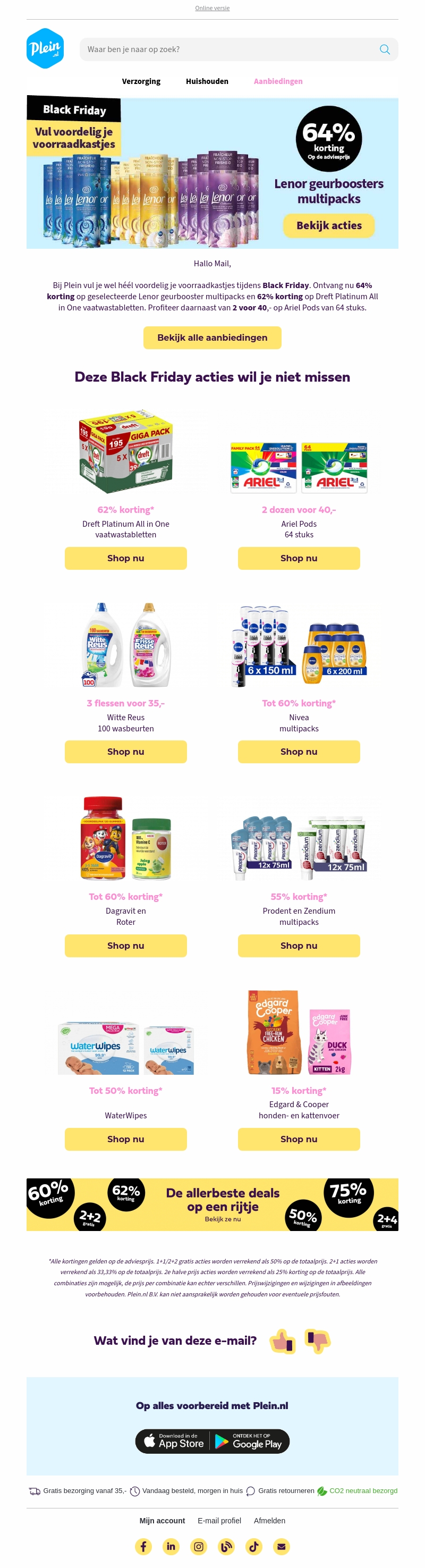 Profiteer van ongelooflijke kortingen tijdens de Black Friday uitverkoop bij Plein.nl. Ontvang tot 64% korting op Lenor geurbooster multipacks en 62% korting op Dreft Platinum All in One vaatwastabletten. Daarnaast zijn er speciale aanbiedingen zoals 2 dozen Ariel Pods voor slechts 40,- en andere verrassingen. Mis de kans niet om uw favoriete producten met flinke kortingen te scoren.