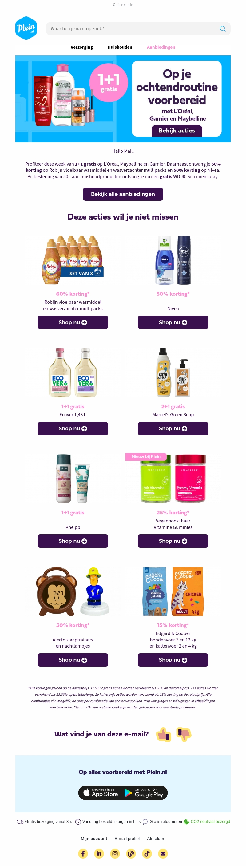 Deze week profiteer je van 1+1 gratis op topmerken zoals L'Oréal, Maybelline en Garnier. Daarnaast ontvang je 60% korting op Robijn vloeibaar wasmiddel en wasverzachter multipacks en 50% korting op Nivea. Ontdek ook andere geweldige aanbiedingen van merken zoals Ecover, Marcel's Green Soap en Veganboost.
