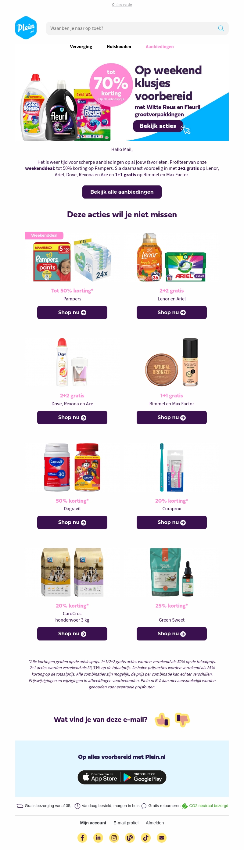 Ontdek deze weekendactie met geweldige kortingen! Krijg 2+2 gratis op topmerken zoals Lenor, Ariel, Dove en Rexona. Daarnaast kun je profiteren van 50% korting op Pampers en vele andere deals. Mis deze kans niet om groot in te slaan op je favoriete producten. Shop nu en bespaar groots!