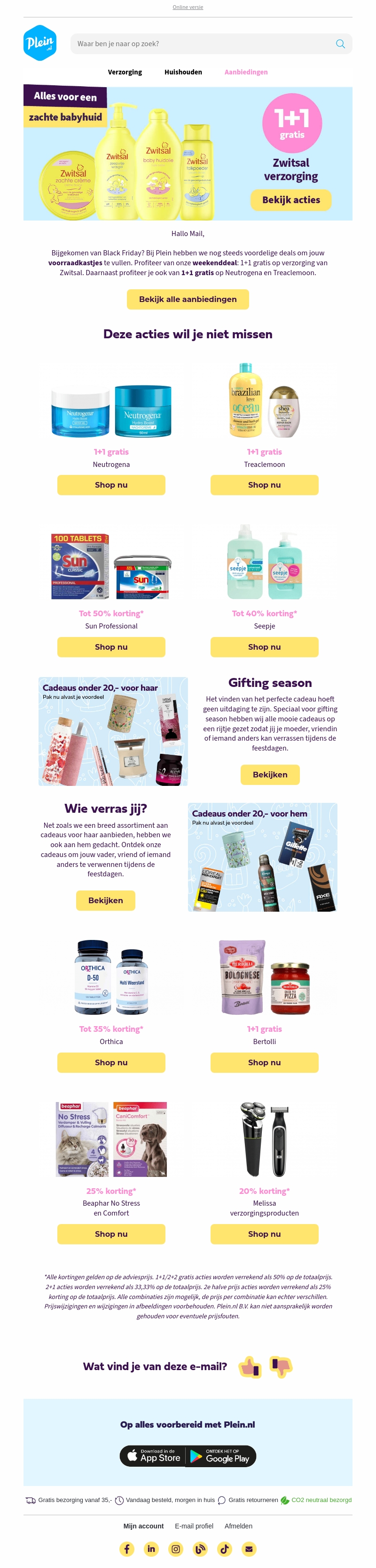 Duik in spectaculaire aanbiedingen bij Plein! Geniet van 1+1 gratis op Zwitsal verzorging, Treaclemoon en Neutrogena. Mis ook de kortingen tot 50% op producten zoals Sun Professional en Seepje niet. Ontdek perfecte cadeaus onder 20 euro voor de gifting season. Bezoek Plein voor nog meer verrassende deals!