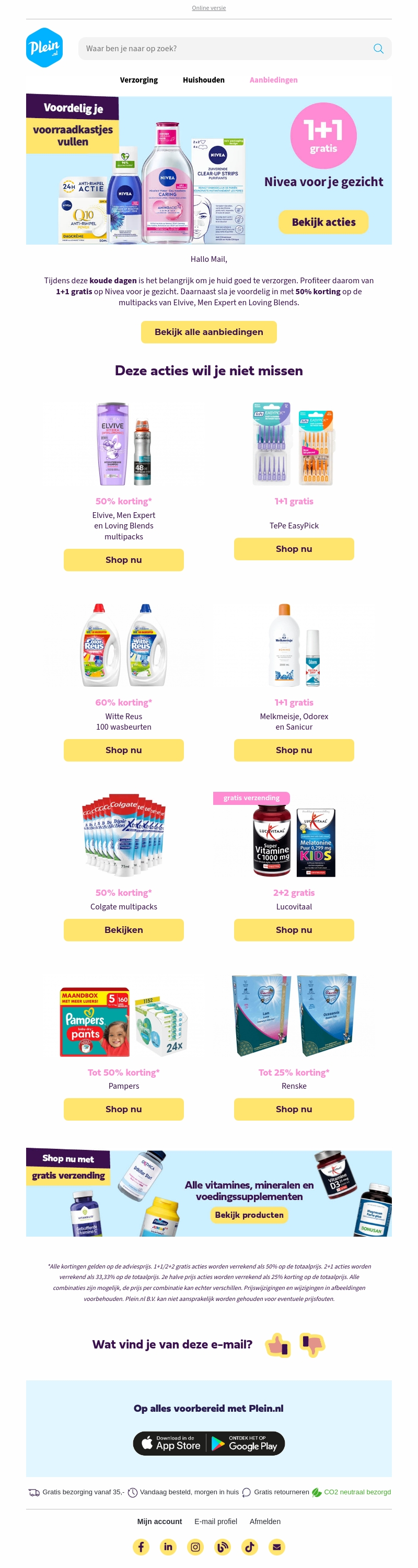 Ontdek de fantastische aanbiedingen van Plein.nl en bespaar tot 50% op Elvive, Loving Blends en Men Expert multipacks. Daarnaast kun je profiteren van 1+1 gratis op geselecteerde Nivea producten. Bekijk ook andere geweldige deals zoals 60% korting op Witte Reus en 2+2 gratis op Lucovitaal. Mis deze kans niet om je favoriete verzorgingsproducten in te slaan.