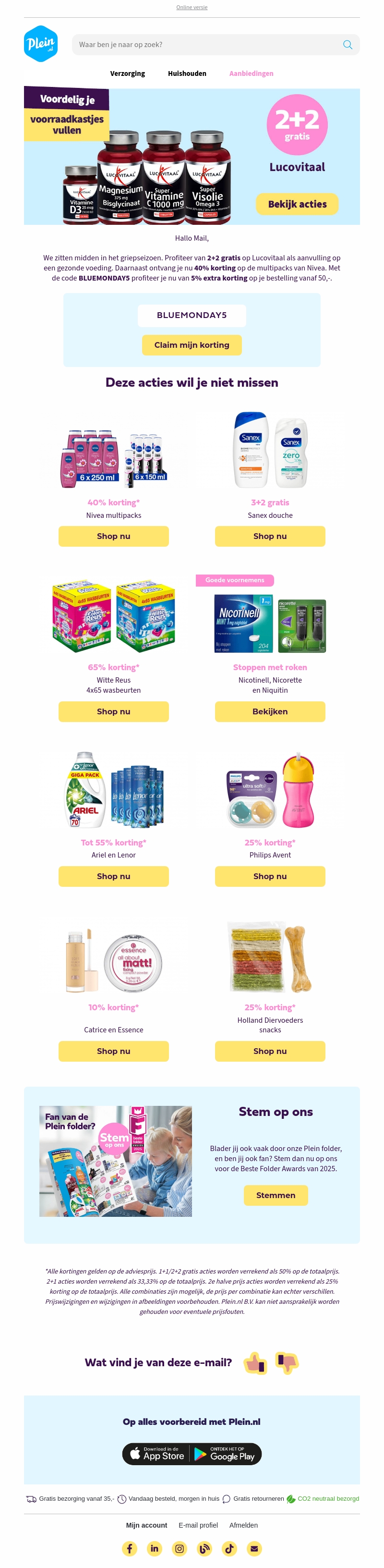 Geniet van 2+2 gratis op Lucovitaal producten en een extra 5% korting op je bestelling. Ontdek ook geweldige kortingen op Nivea, Sanex en meer. Vul je voorraadkast met voordeel en zorg voor jezelf met deze geweldige aanbiedingen.