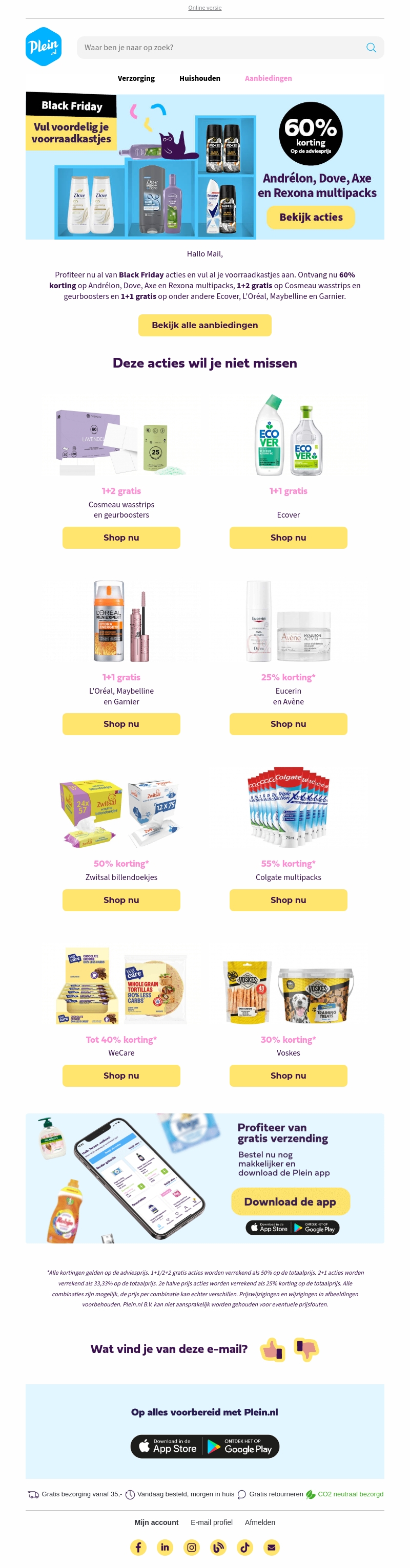 Mis de vroege Black Friday acties niet bij Plein. Geniet van tot wel 60% korting op merken zoals Andrélon, Dove, Axe en Rexona. Plus, speciale 1+1 aanbiedingen op Ecover, L'Oréal, Maybelline en meer. Creëer je voorraadkast voordelig en bespaar op je favoriete producten.