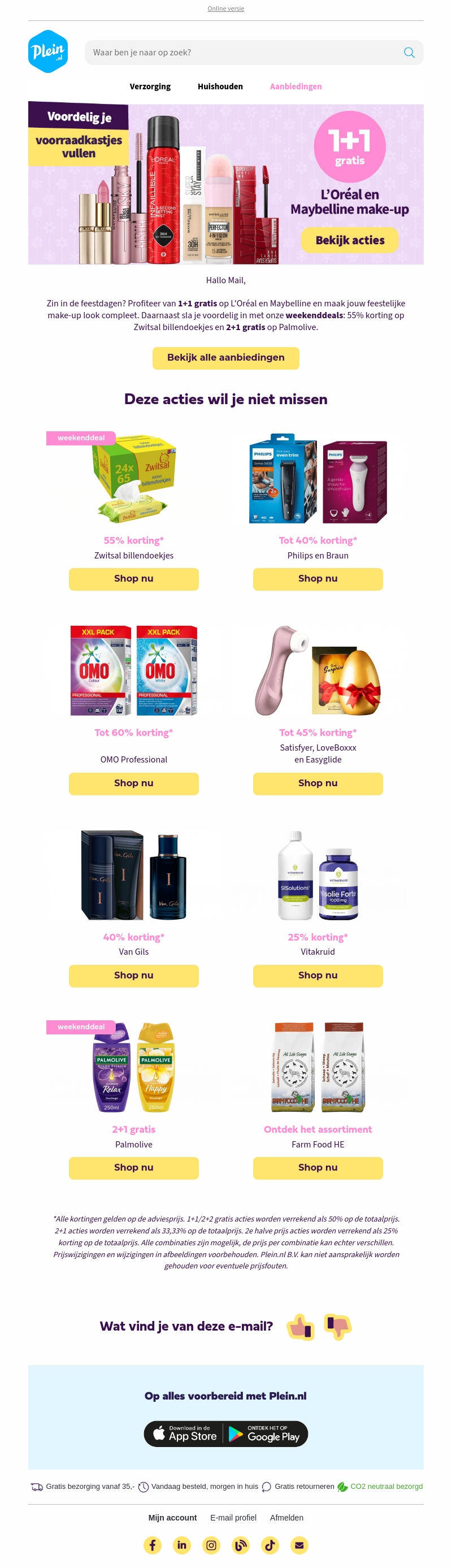 Deze nieuwsbrief van Plein.nl biedt fantastische aanbiedingen met 1+1 gratis op L'Oréal en Maybelline make-up. Daarnaast zijn er weekenddeals zoals 55% korting op Zwitsal billendoekjes. Vull uw voorraad voordelig aan met kortingen tot wel 60% op diverse producten.