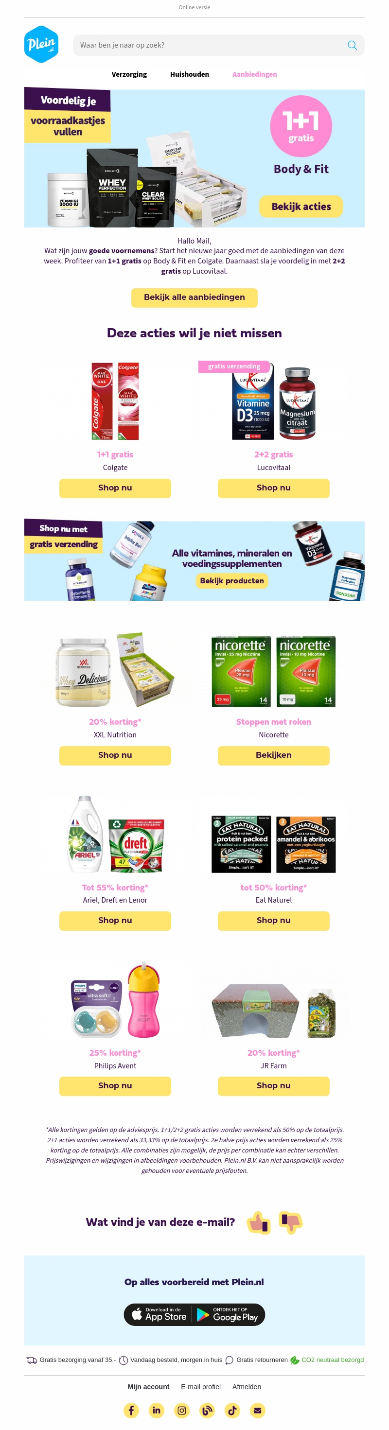 Begin het nieuwe jaar goed met onweerstaanbare aanbiedingen! Profiteer van 1+1 gratis op Body & Fit en Colgate, plus 2+2 gratis op Lucovitaal. Ontvang tot 55% korting op Ariel, Dreft en Lenor. Haast je naar Plein.nl en sla je slag.