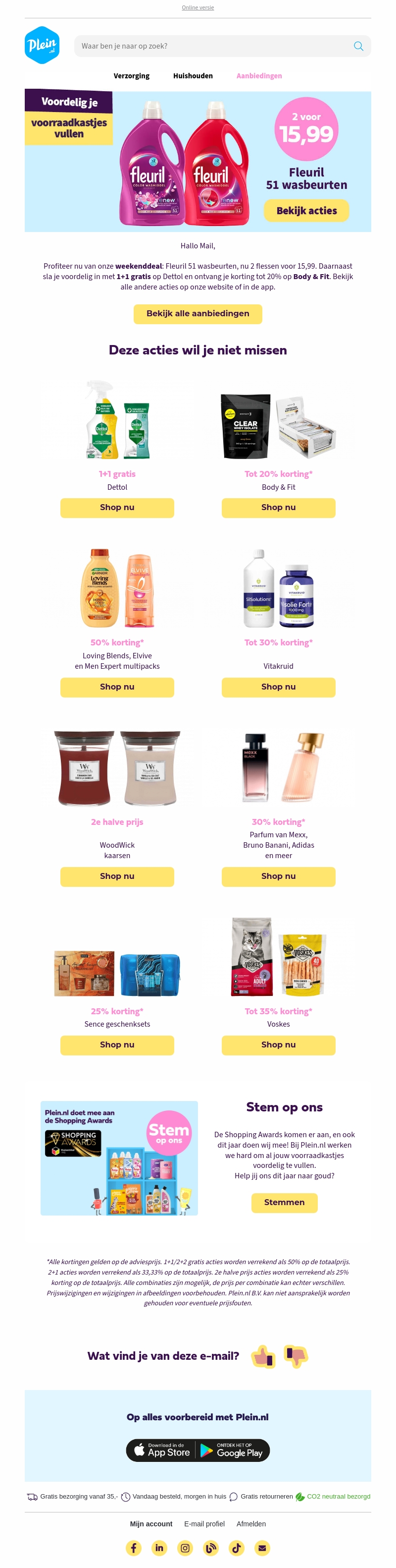 Mis de weekenddeal niet: Fleuril 51 wasbeurten, 2 flessen voor slechts 15,99. Daarnaast kunt u profiteren van 1+1 gratis op Dettol en tot 20% korting bij Body & Fit. Bekijk ook andere aantrekkelijke aanbiedingen, zoals 50% korting op multipacks en 30% korting op parfum.