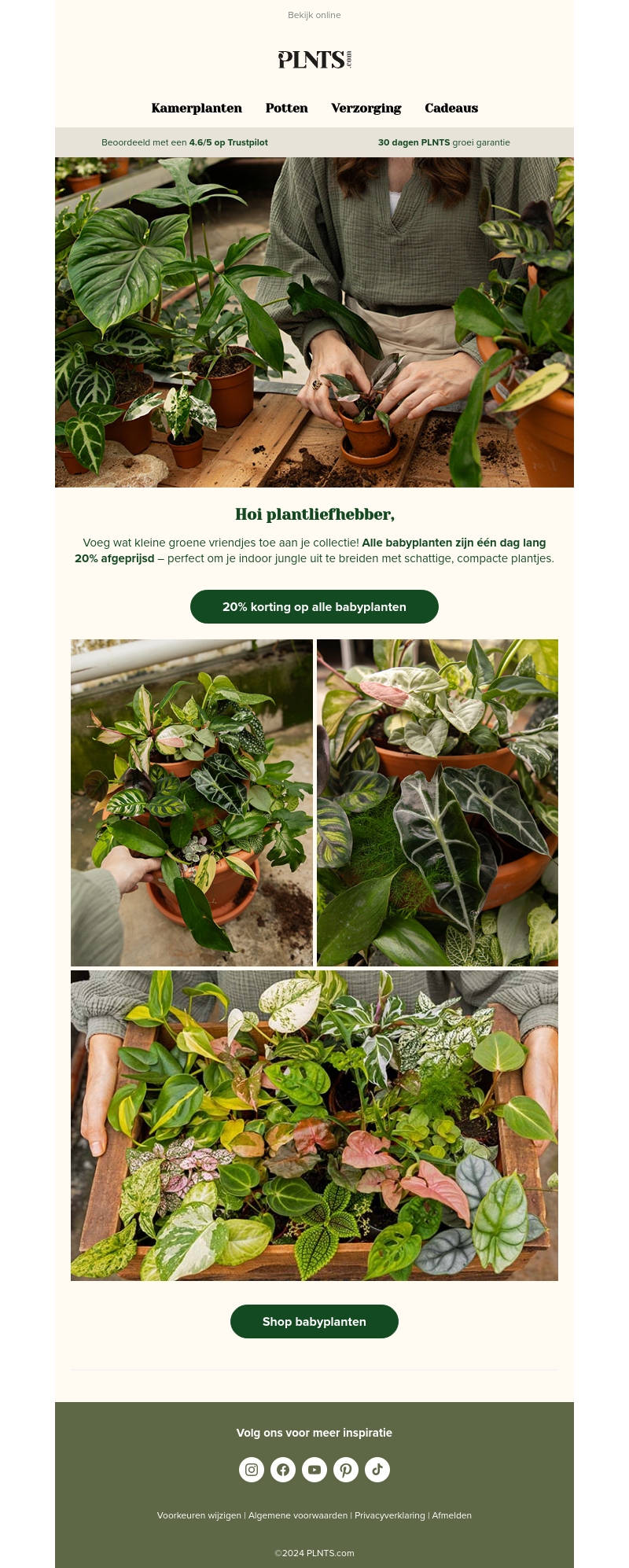 Deze Black Weekend biedt PLNTS.com een fantastische korting van 20% op alle babyplanten. Ideaal voor plantenliefhebbers om hun collectie uit te breiden met schattige, compacte plantjes. Beoordeeld met hoge klanttevredenheid, PLNTS.com is dé plek voor al uw planteneisen. Mis deze eenmalige kans niet om uw indoor jungle te verrijken. Actie geldig voor één dag, dus wees er snel bij!