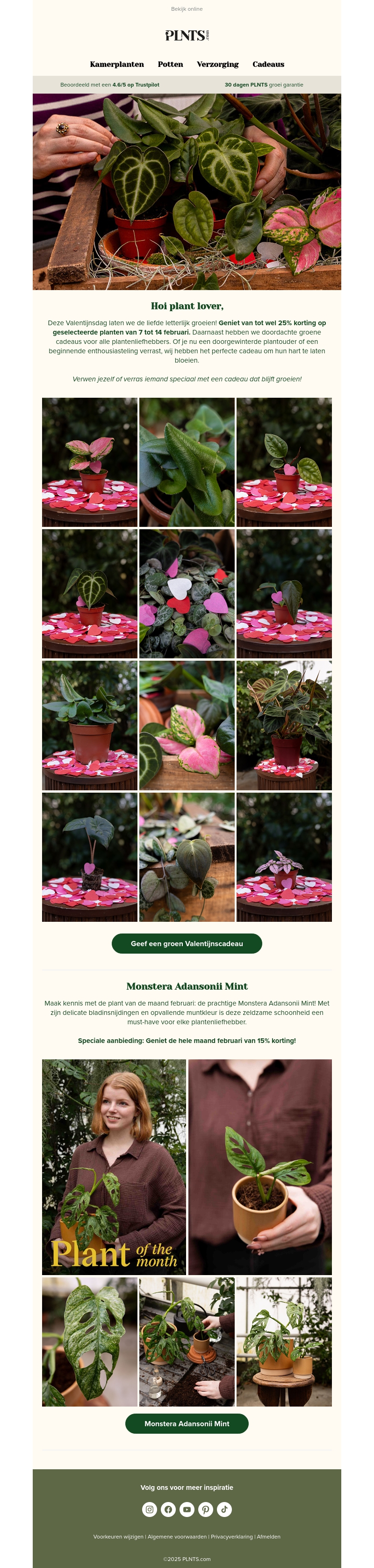 Verras deze Valentijn met een schitterende selectie van planten en geniet van kortingen tot 25%! Of je nu een plantenliefhebber bent of op zoek naar een groen cadeau, er is voor ieder wat wils. Mis de Monstera Adansonii Mint niet, de plant van de maand februari met 15% korting. Laat de liefde bloeien met deze exclusieve aanbiedingen. Beleef de vreugde van planten met onze zorgvuldig geselecteerde collectie.