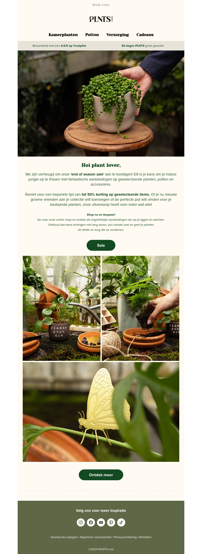 Hoi plant lovers! Onze 'end of season sale' staat voor de deur met fantastische aanbiedingen. Geniet van tot 50% korting op geselecteerde items en fris je indoor jungle op. Mis deze kans niet om nieuwe groene vrienden aan je collectie toe te voegen. Shop nu en bespaar!
