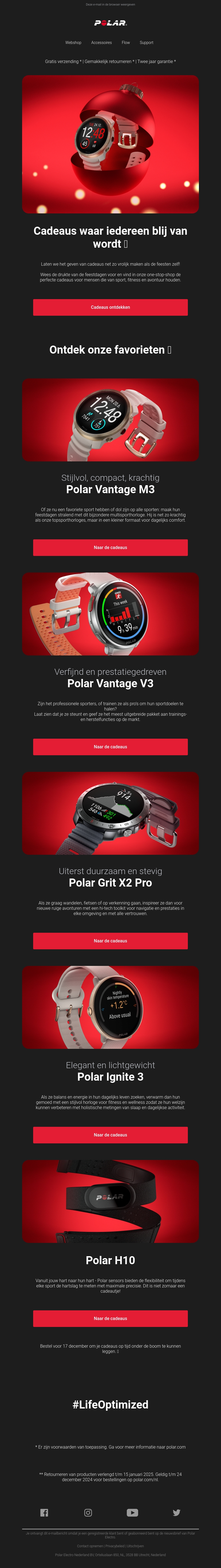 De feestdagen staan voor de deur en wat is een betere manier om te vieren dan met een speciaal cadeau? Verken onze topselectie van stijlvolle en krachtige horloges van Polar. Of je nu op zoek bent naar stijl, prestatie of duurzaamheid, we hebben iets voor iedereen. Mis de kans niet om een perfect cadeau te geven of te ontvangen.