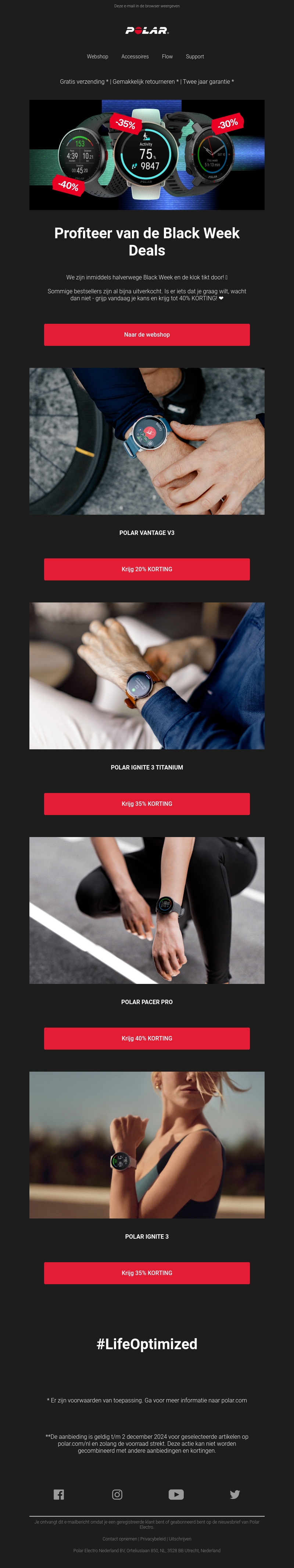Beleef de Black Week bij Polar met kortingen tot wel 40%! Ontdek de nieuwste producten, zoals de Polar Vantage V3 en de Polar Ignite 3 Titanium, en profiteer van unieke aanbiedingen. Mis deze kans niet om jouw prestaties te optimaliseren met de beste technologie. Kortom: het is de ideale week voor sportliefhebbers om hun gadgets te upgraden. Ga snel naar de webshop en benut deze buitenkans!