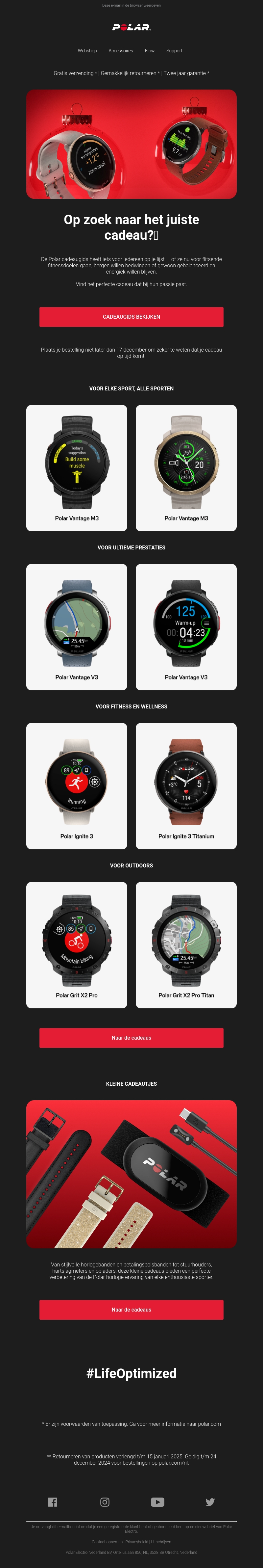 De feestdagen komen eraan en Polar helpt je het perfecte cadeau te vinden. Of je nu zoekt naar sporthorloges voor fitness, wellness of avontuur, Polar heeft een breed scala aan producten. Bekijk onze geselecteerde horloges voor elke sport en ontdek de beste keuzes voor jouw geliefden. Krijg gratis verzending en één jaar garantie op al je aankopen.
